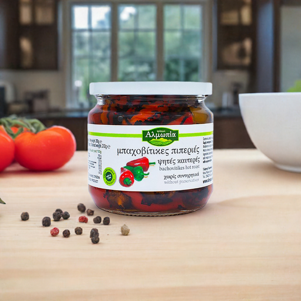 Discover the authentic taste of Greek cuisine with Almopia roasted hot peppers from Bachovita! These peppers, full of intense flavor and aroma, are prepared without preservatives, preserving the purity and quality of their natural ingredients.