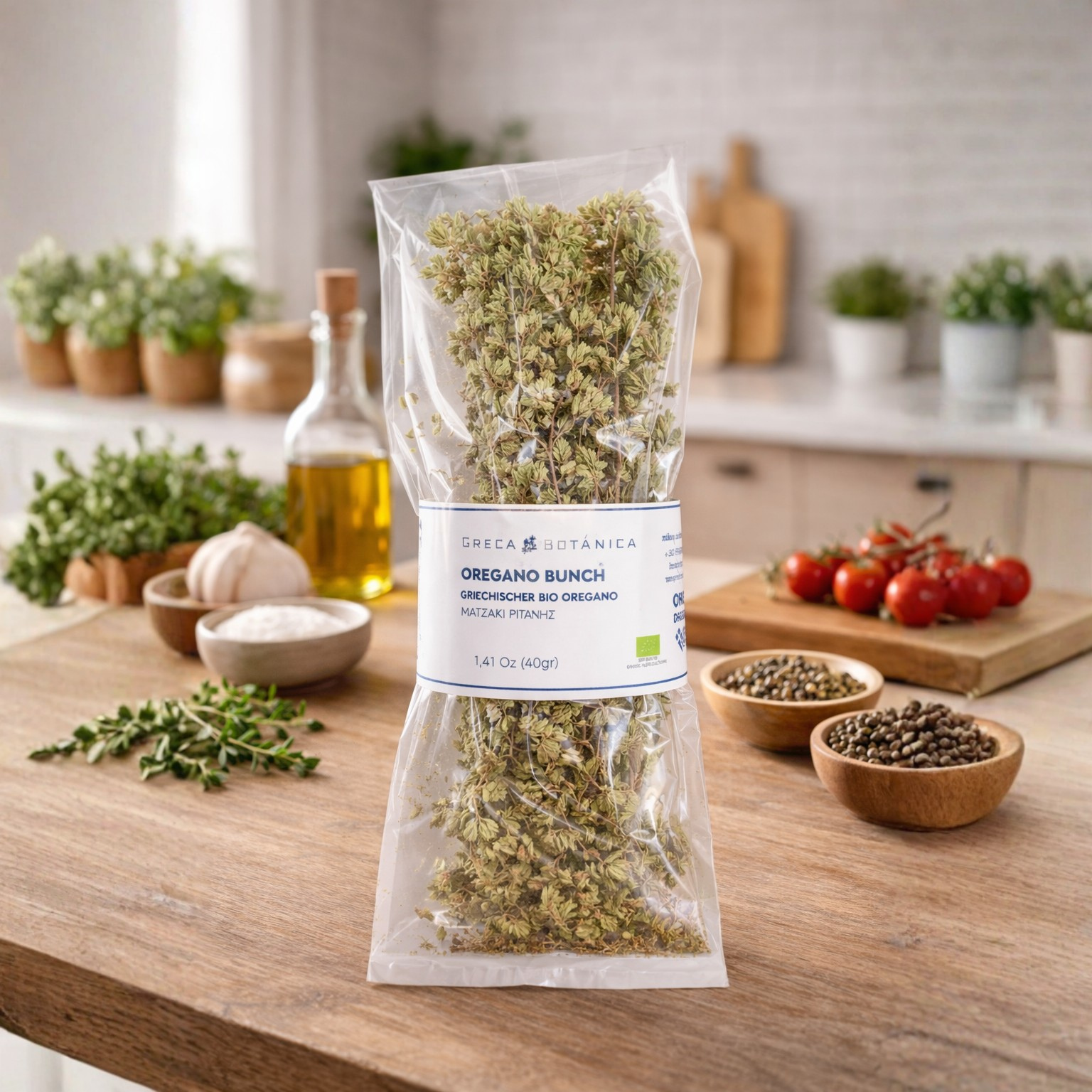 - Gedroogde en geraspte oregano met een hoog gehalte aan etherische oliën.